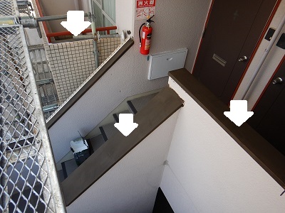 雨を受ける面台や笠木部分の防水(白い矢印部分)