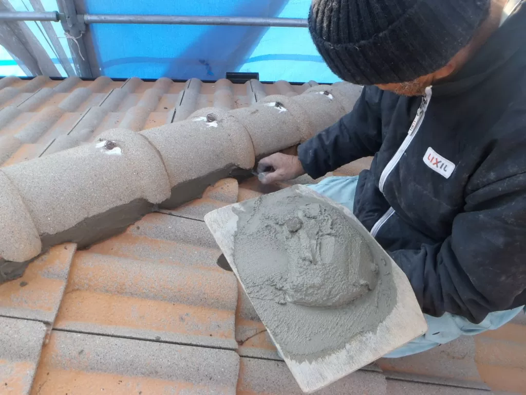 写真の青色矢印部分、棟押えの部分がグニュっと曲がっています。