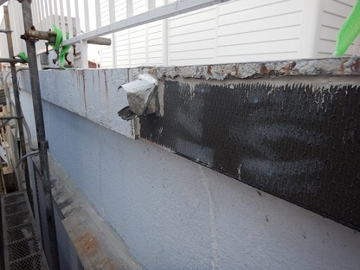 壁の傷んだ部分を取り除き、ベランダのクラックを補修したところ