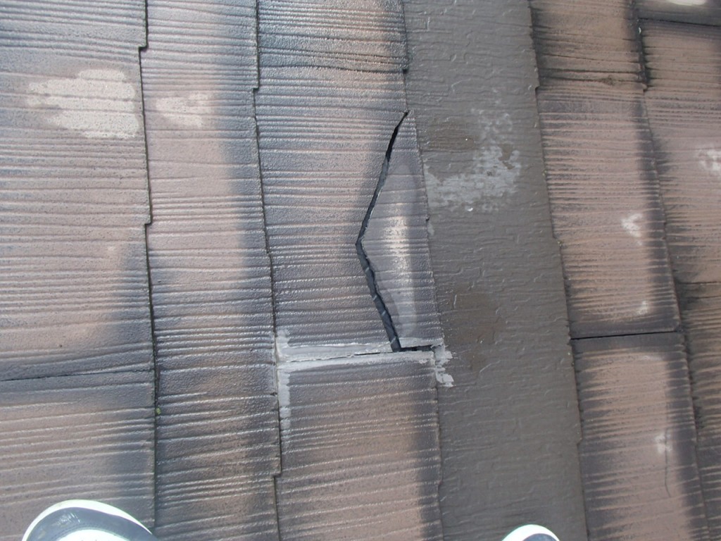 表面の塗膜の経年劣化と依然に塗り替えた時に屋根の補修あとが見られます。