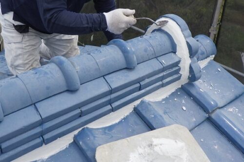 屋根の上では、左官さんが屋根漆喰施工中。