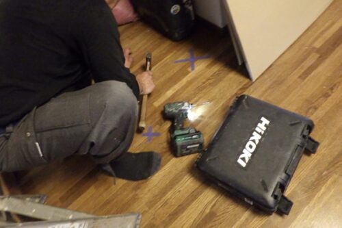 床の張替前に床鳴りをチェックする様子。