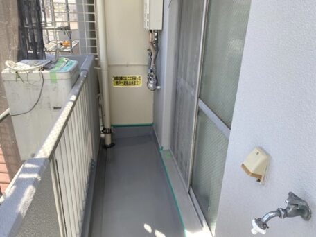 ベランダの土間防水のため、洗濯機を一時的に足場へ避難させました。